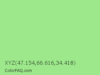XYZ 47.154,66.616,34.418 Color is a light green color and the nearest color is Feijoa #9fdd8c. Hex code #9ce88a and RGB value is rgb(156,232,138). In RGB color space, this color is composed of 61% red, 91% green, 54% blue, In CMYK color space, this color is composed of 33% cyan, 0% magenta, 41% yellow , 9% black , In HSL color space, this color has a hue angle of 109° , 67% saturation and 73% lightness.