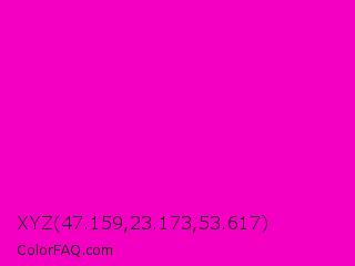 XYZ 47.159,23.173,53.617 Color is a normal magenta color and the nearest color is Purple Pizzazz #ff00cc. Hex code #f400c3 and RGB value is rgb(244,0,195). In RGB color space, this color is composed of 96% red, 0% green, 76% blue, In CMYK color space, this color is composed of 0% cyan, 100% magenta, 20% yellow , 4% black , In HSL color space, this color has a hue angle of 312° , 100% saturation and 48% lightness.