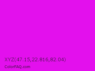 XYZ 47.15,22.816,82.04 Color is a normal magenta color and the nearest color is Phlox #df00ff. Hex code #e310ed and RGB value is rgb(227,16,237). In RGB color space, this color is composed of 89% red, 6% green, 93% blue, In CMYK color space, this color is composed of 4% cyan, 93% magenta, 0% yellow , 7% black , In HSL color space, this color has a hue angle of 297° , 87% saturation and 50% lightness.