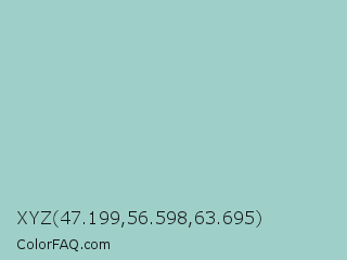 XYZ 47.199,56.598,63.695 Color is a light cyan color and the nearest color is Sinbad #9fd7d3. Hex code #9ed0c9 and RGB value is rgb(158,208,201). In RGB color space, this color is composed of 62% red, 82% green, 79% blue, In CMYK color space, this color is composed of 24% cyan, 0% magenta, 3% yellow , 18% black , In HSL color space, this color has a hue angle of 172° , 35% saturation and 72% lightness.