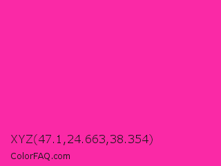 XYZ 47.1,24.663,38.354 Color is a normal magenta color and the nearest color is Persian Rose #fe28a2. Hex code #fa29a6 and RGB value is rgb(250,41,166). In RGB color space, this color is composed of 98% red, 16% green, 65% blue, In CMYK color space, this color is composed of 0% cyan, 84% magenta, 34% yellow , 2% black , In HSL color space, this color has a hue angle of 324° , 95% saturation and 57% lightness.