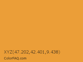 XYZ 47.202,42.401,9.438 Color is a normal orange color and the nearest color is Fire Bush #e89928. Hex code #eb9e38 and RGB value is rgb(235,158,56). In RGB color space, this color is composed of 92% red, 62% green, 22% blue, In CMYK color space, this color is composed of 0% cyan, 33% magenta, 76% yellow , 8% black , In HSL color space, this color has a hue angle of 34° , 82% saturation and 57% lightness.
