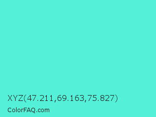 XYZ 47.211,69.163,75.827 Color is a light cyan color and the nearest color is Turquoise #40e0d0. Hex code #54f0d8 and RGB value is rgb(84,240,216). In RGB color space, this color is composed of 33% red, 94% green, 85% blue, In CMYK color space, this color is composed of 65% cyan, 0% magenta, 10% yellow , 6% black , In HSL color space, this color has a hue angle of 171° , 84% saturation and 64% lightness.