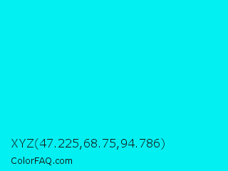 XYZ 47.225,68.75,94.786 Color is a normal cyan color and the nearest color is Turquoise Blue #00ffef. Hex code #03f0f2 and RGB value is rgb(3,240,242). In RGB color space, this color is composed of 1% red, 94% green, 95% blue, In CMYK color space, this color is composed of 99% cyan, 1% magenta, 0% yellow , 5% black , In HSL color space, this color has a hue angle of 181° , 98% saturation and 48% lightness.