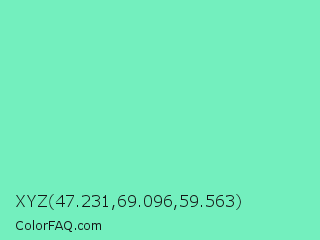XYZ 47.231,69.096,59.563 Color is a light green color and the nearest color is Bermuda #7dd8c6. Hex code #73efbe and RGB value is rgb(115,239,190). In RGB color space, this color is composed of 45% red, 94% green, 75% blue, In CMYK color space, this color is composed of 52% cyan, 0% magenta, 21% yellow , 6% black , In HSL color space, this color has a hue angle of 156° , 79% saturation and 69% lightness.