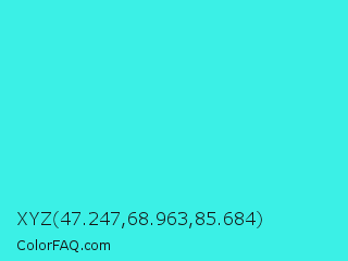 XYZ 47.247,68.963,85.684 Color is a normal cyan color and the nearest color is Turquoise #40e0d0. Hex code #3bf0e6 and RGB value is rgb(59,240,230). In RGB color space, this color is composed of 23% red, 94% green, 90% blue, In CMYK color space, this color is composed of 75% cyan, 0% magenta, 4% yellow , 6% black , In HSL color space, this color has a hue angle of 177° , 86% saturation and 59% lightness.
