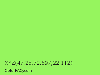 XYZ 47.25,72.597,22.112 Color is a light green color and the nearest color is Inchworm #b2ec5d. Hex code #96f55e and RGB value is rgb(150,245,94). In RGB color space, this color is composed of 59% red, 96% green, 37% blue, In CMYK color space, this color is composed of 39% cyan, 0% magenta, 62% yellow , 4% black , In HSL color space, this color has a hue angle of 98° , 88% saturation and 66% lightness.