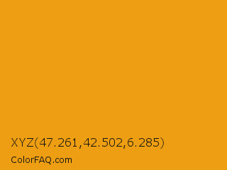 XYZ 47.261,42.502,6.285 Color is a normal orange color and the nearest color is Gamboge #e49b0f. Hex code #ed9e12 and RGB value is rgb(237,158,18). In RGB color space, this color is composed of 93% red, 62% green, 7% blue, In CMYK color space, this color is composed of 0% cyan, 33% magenta, 92% yellow , 7% black , In HSL color space, this color has a hue angle of 38° , 86% saturation and 50% lightness.