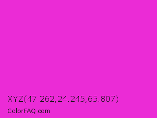 XYZ 47.262,24.245,65.807 Color is a normal magenta color and the nearest color is Razzle Dazzle Rose #ff33cc. Hex code #eb2bd6 and RGB value is rgb(235,43,214). In RGB color space, this color is composed of 92% red, 17% green, 84% blue, In CMYK color space, this color is composed of 0% cyan, 82% magenta, 9% yellow , 8% black , In HSL color space, this color has a hue angle of 307° , 83% saturation and 55% lightness.