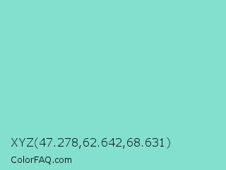 XYZ 47.278,62.642,68.631 Color is a light cyan color and the nearest color is Middle Blue Green #8dd9cc. Hex code #83e0cf and RGB value is rgb(131,224,207). In RGB color space, this color is composed of 51% red, 88% green, 81% blue, In CMYK color space, this color is composed of 42% cyan, 0% magenta, 8% yellow , 12% black , In HSL color space, this color has a hue angle of 169° , 60% saturation and 70% lightness.