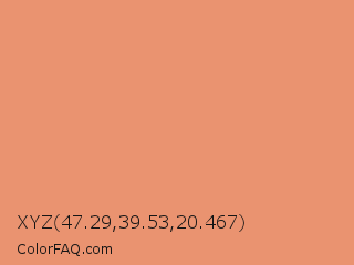 XYZ 47.29,39.53,20.467 Color is a light orange color and the nearest color is Apricot #eb9373. Hex code #ea9370 and RGB value is rgb(234,147,112). In RGB color space, this color is composed of 92% red, 58% green, 44% blue, In CMYK color space, this color is composed of 0% cyan, 37% magenta, 52% yellow , 8% black , In HSL color space, this color has a hue angle of 17° , 74% saturation and 68% lightness.