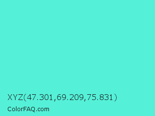 XYZ 47.301,69.209,75.831 Color is a light cyan color and the nearest color is Turquoise #40e0d0. Hex code #55f0d8 and RGB value is rgb(85,240,216). In RGB color space, this color is composed of 33% red, 94% green, 85% blue, In CMYK color space, this color is composed of 65% cyan, 0% magenta, 10% yellow , 6% black , In HSL color space, this color has a hue angle of 171° , 84% saturation and 64% lightness.