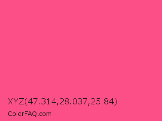 XYZ 47.314,28.037,25.84 Color is a light rose color and the nearest color is French Rose #f64a8a. Hex code #fc4f87 and RGB value is rgb(252,79,135). In RGB color space, this color is composed of 99% red, 31% green, 53% blue, In CMYK color space, this color is composed of 0% cyan, 69% magenta, 46% yellow , 1% black , In HSL color space, this color has a hue angle of 341° , 97% saturation and 65% lightness.