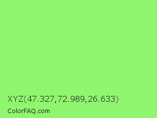 XYZ 47.327,72.989,26.633 Color is a light green color and the nearest color is Light Green #90ee90. Hex code #90f66f and RGB value is rgb(144,246,111). In RGB color space, this color is composed of 56% red, 96% green, 44% blue, In CMYK color space, this color is composed of 41% cyan, 0% magenta, 55% yellow , 4% black , In HSL color space, this color has a hue angle of 105° , 88% saturation and 70% lightness.