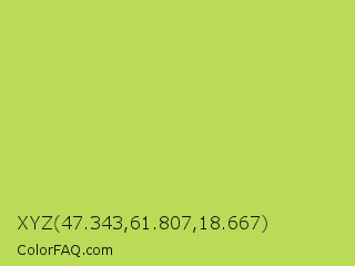 XYZ 47.343,61.807,18.667 Color is a normal lime color and the nearest color is June Bud #bdda57. Hex code #badb58 and RGB value is rgb(186,219,88). In RGB color space, this color is composed of 73% red, 86% green, 35% blue, In CMYK color space, this color is composed of 15% cyan, 0% magenta, 60% yellow , 14% black , In HSL color space, this color has a hue angle of 75° , 65% saturation and 60% lightness.