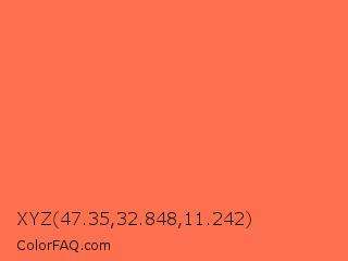 XYZ 47.35,32.848,11.242 Color is a light red color and the nearest color is Outrageous Orange #ff6e4a. Hex code #fc704f and RGB value is rgb(252,112,79). In RGB color space, this color is composed of 99% red, 44% green, 31% blue, In CMYK color space, this color is composed of 0% cyan, 56% magenta, 69% yellow , 1% black , In HSL color space, this color has a hue angle of 11° , 97% saturation and 65% lightness.