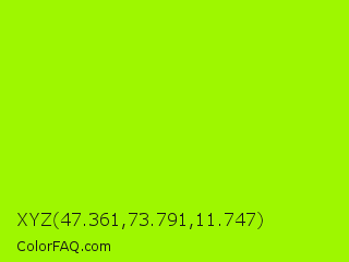 XYZ 47.361,73.791,11.747 Color is a normal green color and the nearest color is Spring Bud #a7fc00. Hex code #9ef700 and RGB value is rgb(158,247,0). In RGB color space, this color is composed of 62% red, 97% green, 0% blue, In CMYK color space, this color is composed of 36% cyan, 0% magenta, 100% yellow , 3% black , In HSL color space, this color has a hue angle of 82° , 100% saturation and 48% lightness.