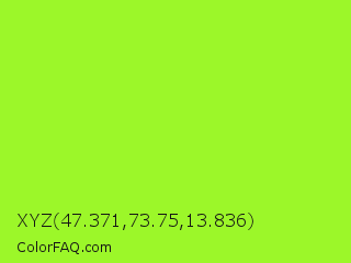 XYZ 47.371,73.75,13.836 Color is a normal green color and the nearest color is Green Lizard #a7f432. Hex code #9cf729 and RGB value is rgb(156,247,41). In RGB color space, this color is composed of 61% red, 97% green, 16% blue, In CMYK color space, this color is composed of 37% cyan, 0% magenta, 83% yellow , 3% black , In HSL color space, this color has a hue angle of 87° , 93% saturation and 56% lightness.