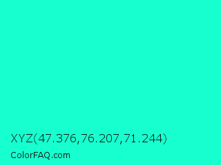XYZ 47.376,76.207,71.244 Color is a normal cyan color and the nearest color is Bright Turquoise #08e8de. Hex code #17ffcf and RGB value is rgb(23,255,207). In RGB color space, this color is composed of 9% red, 100% green, 81% blue, In CMYK color space, this color is composed of 91% cyan, 0% magenta, 19% yellow , 0% black , In HSL color space, this color has a hue angle of 168° , 100% saturation and 55% lightness.