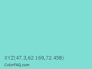 XYZ 47.3,62.169,72.458 Color is a light cyan color and the nearest color is Riptide #8be6d8. Hex code #80dfd5 and RGB value is rgb(128,223,213). In RGB color space, this color is composed of 50% red, 87% green, 84% blue, In CMYK color space, this color is composed of 43% cyan, 0% magenta, 4% yellow , 13% black , In HSL color space, this color has a hue angle of 174° , 60% saturation and 69% lightness.