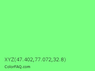 XYZ 47.402,77.072,32.8 Color is a light green color and the nearest color is Very Light Malachite Green #64e986. Hex code #78ff80 and RGB value is rgb(120,255,128). In RGB color space, this color is composed of 47% red, 100% green, 50% blue, In CMYK color space, this color is composed of 53% cyan, 0% magenta, 50% yellow , 0% black , In HSL color space, this color has a hue angle of 124° , 100% saturation and 74% lightness.