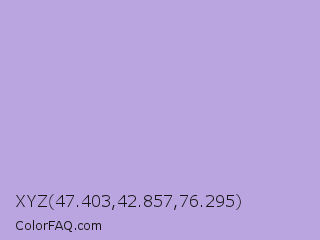 XYZ 47.403,42.857,76.295 Color is a light violet color and the nearest color is Biloba Flower #b2a1ea. Hex code #bba5e0 and RGB value is rgb(187,165,224). In RGB color space, this color is composed of 73% red, 65% green, 88% blue, In CMYK color space, this color is composed of 17% cyan, 26% magenta, 0% yellow , 12% black , In HSL color space, this color has a hue angle of 262° , 49% saturation and 76% lightness.