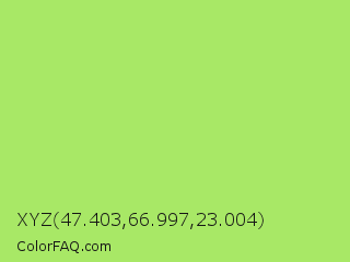 XYZ 47.403,66.997,23.004 Color is a light green color and the nearest color is Inchworm #b2ec5d. Hex code #a8e866 and RGB value is rgb(168,232,102). In RGB color space, this color is composed of 66% red, 91% green, 40% blue, In CMYK color space, this color is composed of 28% cyan, 0% magenta, 56% yellow , 9% black , In HSL color space, this color has a hue angle of 90° , 74% saturation and 65% lightness.