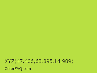 XYZ 47.406,63.895,14.989 Color is a normal lime color and the nearest color is Conifer #acdd4d. Hex code #b8e042 and RGB value is rgb(184,224,66). In RGB color space, this color is composed of 72% red, 88% green, 26% blue, In CMYK color space, this color is composed of 18% cyan, 0% magenta, 71% yellow , 12% black , In HSL color space, this color has a hue angle of 75° , 72% saturation and 57% lightness.