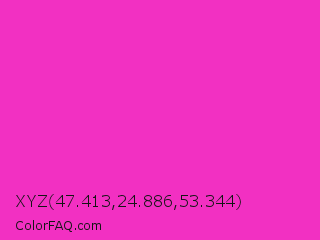 XYZ 47.413,24.886,53.344 Color is a normal magenta color and the nearest color is Razzle Dazzle Rose #ff33cc. Hex code #f230c2 and RGB value is rgb(242,48,194). In RGB color space, this color is composed of 95% red, 19% green, 76% blue, In CMYK color space, this color is composed of 0% cyan, 80% magenta, 20% yellow , 5% black , In HSL color space, this color has a hue angle of 315° , 88% saturation and 57% lightness.