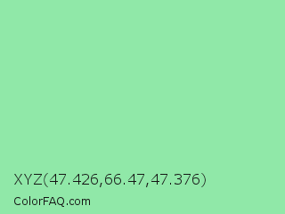 XYZ 47.426,66.47,47.376 Color is a light green color and the nearest color is Teal Deer #99e6b3. Hex code #90e8a8 and RGB value is rgb(144,232,168). In RGB color space, this color is composed of 56% red, 91% green, 66% blue, In CMYK color space, this color is composed of 38% cyan, 0% magenta, 28% yellow , 9% black , In HSL color space, this color has a hue angle of 136° , 66% saturation and 74% lightness.