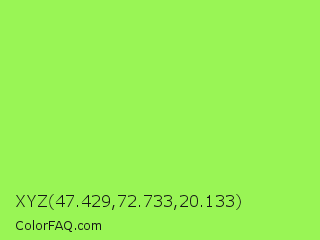 XYZ 47.429,72.733,20.133 Color is a light green color and the nearest color is Inchworm #b2ec5d. Hex code #99f555 and RGB value is rgb(153,245,85). In RGB color space, this color is composed of 60% red, 96% green, 33% blue, In CMYK color space, this color is composed of 38% cyan, 0% magenta, 65% yellow , 4% black , In HSL color space, this color has a hue angle of 95° , 89% saturation and 65% lightness.