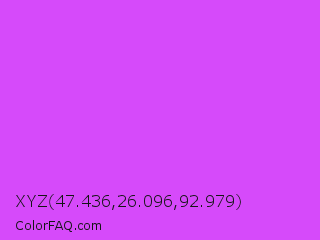 XYZ 47.436,26.096,92.979 Color is a light purple color and the nearest color is Heliotrope #df73ff. Hex code #d64afa and RGB value is rgb(214,74,250). In RGB color space, this color is composed of 84% red, 29% green, 98% blue, In CMYK color space, this color is composed of 14% cyan, 70% magenta, 0% yellow , 2% black , In HSL color space, this color has a hue angle of 288° , 95% saturation and 64% lightness.