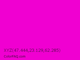 XYZ 47.444,23.129,62.285 Color is a normal magenta color and the nearest color is Purple Pizzazz #ff00cc. Hex code #f000d1 and RGB value is rgb(240,0,209). In RGB color space, this color is composed of 94% red, 0% green, 82% blue, In CMYK color space, this color is composed of 0% cyan, 100% magenta, 13% yellow , 6% black , In HSL color space, this color has a hue angle of 308° , 100% saturation and 47% lightness.