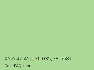 XYZ 47.452,61.035,38.558 Color is a light green color and the nearest color is Granny Smith Apple #a8e4a0. Hex code #abda97 and RGB value is rgb(171,218,151). In RGB color space, this color is composed of 67% red, 85% green, 59% blue, In CMYK color space, this color is composed of 22% cyan, 0% magenta, 31% yellow , 15% black , In HSL color space, this color has a hue angle of 102° , 48% saturation and 72% lightness.