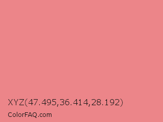 XYZ 47.495,36.414,28.192 Color is a light red color and the nearest color is Light Coral #f08080. Hex code #ec8589 and RGB value is rgb(236,133,137). In RGB color space, this color is composed of 93% red, 52% green, 54% blue, In CMYK color space, this color is composed of 0% cyan, 44% magenta, 42% yellow , 7% black , In HSL color space, this color has a hue angle of 358° , 73% saturation and 72% lightness.