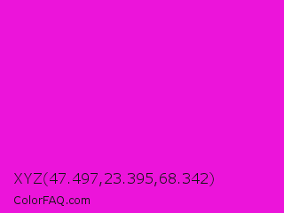 XYZ 47.497,23.395,68.342 Color is a normal magenta color and the nearest color is Hot Magenta #ff1dce. Hex code #ec14da and RGB value is rgb(236,20,218). In RGB color space, this color is composed of 93% red, 8% green, 85% blue, In CMYK color space, this color is composed of 0% cyan, 92% magenta, 8% yellow , 7% black , In HSL color space, this color has a hue angle of 305° , 85% saturation and 50% lightness.