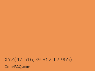 XYZ 47.516,39.812,12.965 Color is a light orange color and the nearest color is Big Foot Feet #e88e5a. Hex code #ef9351 and RGB value is rgb(239,147,81). In RGB color space, this color is composed of 94% red, 58% green, 32% blue, In CMYK color space, this color is composed of 0% cyan, 38% magenta, 66% yellow , 6% black , In HSL color space, this color has a hue angle of 25° , 83% saturation and 63% lightness.