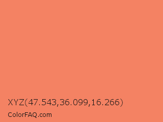 XYZ 47.543,36.099,16.266 Color is a light red color and the nearest color is Coral Reef Hipster Salmon #fd7c6e. Hex code #f48263 and RGB value is rgb(244,130,99). In RGB color space, this color is composed of 96% red, 51% green, 39% blue, In CMYK color space, this color is composed of 0% cyan, 47% magenta, 59% yellow , 4% black , In HSL color space, this color has a hue angle of 13° , 87% saturation and 67% lightness.