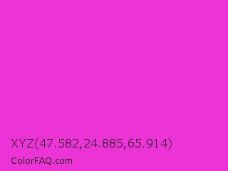 XYZ 47.582,24.885,65.914 Color is a normal magenta color and the nearest color is Razzle Dazzle Rose #ff33cc. Hex code #eb33d6 and RGB value is rgb(235,51,214). In RGB color space, this color is composed of 92% red, 20% green, 84% blue, In CMYK color space, this color is composed of 0% cyan, 78% magenta, 9% yellow , 8% black , In HSL color space, this color has a hue angle of 307° , 82% saturation and 56% lightness.