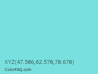 XYZ 47.586,62.578,78.678 Color is a light cyan color and the nearest color is Aquamarine Blue #71d9e2. Hex code #78e0de and RGB value is rgb(120,224,222). In RGB color space, this color is composed of 47% red, 88% green, 87% blue, In CMYK color space, this color is composed of 46% cyan, 0% magenta, 1% yellow , 12% black , In HSL color space, this color has a hue angle of 179° , 63% saturation and 67% lightness.