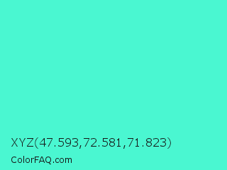 XYZ 47.593,72.581,71.823 Color is a light cyan color and the nearest color is Turquoise #40e0d0. Hex code #4af7d1 and RGB value is rgb(74,247,209). In RGB color space, this color is composed of 29% red, 97% green, 82% blue, In CMYK color space, this color is composed of 70% cyan, 0% magenta, 15% yellow , 3% black , In HSL color space, this color has a hue angle of 167° , 92% saturation and 63% lightness.