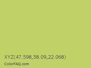 XYZ 47.598,58.09,22.068 Color is a light yellow color and the nearest color is Wild Willow #b9c46a. Hex code #c2d169 and RGB value is rgb(194,209,105). In RGB color space, this color is composed of 76% red, 82% green, 41% blue, In CMYK color space, this color is composed of 7% cyan, 0% magenta, 50% yellow , 18% black , In HSL color space, this color has a hue angle of 69° , 53% saturation and 62% lightness.