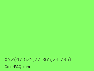 XYZ 47.625,77.365,24.735 Color is a light green color and the nearest color is Screamin Green #66ff66. Hex code #84ff65 and RGB value is rgb(132,255,101). In RGB color space, this color is composed of 52% red, 100% green, 40% blue, In CMYK color space, this color is composed of 48% cyan, 0% magenta, 60% yellow , 0% black , In HSL color space, this color has a hue angle of 108° , 100% saturation and 70% lightness.
