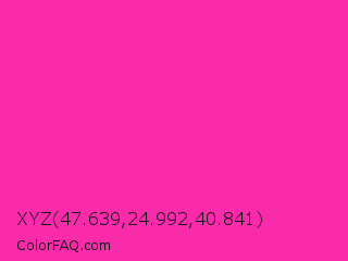 XYZ 47.639,24.992,40.841 Color is a normal magenta color and the nearest color is Persian Rose #fe28a2. Hex code #fa2bab and RGB value is rgb(250,43,171). In RGB color space, this color is composed of 98% red, 17% green, 67% blue, In CMYK color space, this color is composed of 0% cyan, 83% magenta, 32% yellow , 2% black , In HSL color space, this color has a hue angle of 323° , 95% saturation and 57% lightness.