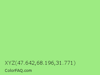 XYZ 47.642,68.196,31.771 Color is a light green color and the nearest color is Feijoa #9fdd8c. Hex code #9deb82 and RGB value is rgb(157,235,130). In RGB color space, this color is composed of 62% red, 92% green, 51% blue, In CMYK color space, this color is composed of 33% cyan, 0% magenta, 45% yellow , 8% black , In HSL color space, this color has a hue angle of 105° , 72% saturation and 72% lightness.