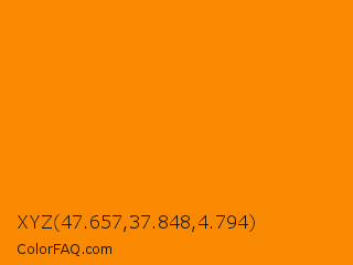 XYZ 47.657,37.848,4.794 Color is a normal orange color and the nearest color is Tangerine #f28500. Hex code #f88900 and RGB value is rgb(248,137,0). In RGB color space, this color is composed of 97% red, 54% green, 0% blue, In CMYK color space, this color is composed of 0% cyan, 45% magenta, 100% yellow , 3% black , In HSL color space, this color has a hue angle of 33° , 100% saturation and 49% lightness.