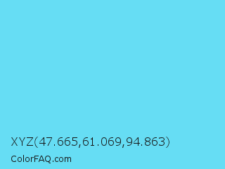 XYZ 47.665,61.069,94.863 Color is a light cyan color and the nearest color is Turquoise Blue #6cdae7. Hex code #66ddf4 and RGB value is rgb(102,221,244). In RGB color space, this color is composed of 40% red, 87% green, 96% blue, In CMYK color space, this color is composed of 58% cyan, 9% magenta, 0% yellow , 4% black , In HSL color space, this color has a hue angle of 190° , 87% saturation and 68% lightness.