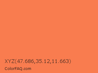 XYZ 47.686,35.12,11.663 Color is a light orange color and the nearest color is Coral #ff7f50. Hex code #f97c4f and RGB value is rgb(249,124,79). In RGB color space, this color is composed of 98% red, 49% green, 31% blue, In CMYK color space, this color is composed of 0% cyan, 50% magenta, 68% yellow , 2% black , In HSL color space, this color has a hue angle of 16° , 93% saturation and 64% lightness.