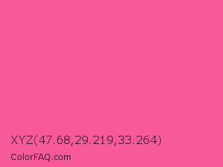 XYZ 47.68,29.219,33.264 Color is a light rose color and the nearest color is Violet Red #f75394. Hex code #f75999 and RGB value is rgb(247,89,153). In RGB color space, this color is composed of 97% red, 35% green, 60% blue, In CMYK color space, this color is composed of 0% cyan, 64% magenta, 38% yellow , 3% black , In HSL color space, this color has a hue angle of 336° , 91% saturation and 66% lightness.