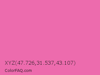 XYZ 47.726,31.537,43.107 Color is a light rose color and the nearest color is Cyclamen #f56fa1. Hex code #ed6bad and RGB value is rgb(237,107,173). In RGB color space, this color is composed of 93% red, 42% green, 68% blue, In CMYK color space, this color is composed of 0% cyan, 55% magenta, 27% yellow , 7% black , In HSL color space, this color has a hue angle of 330° , 78% saturation and 67% lightness.